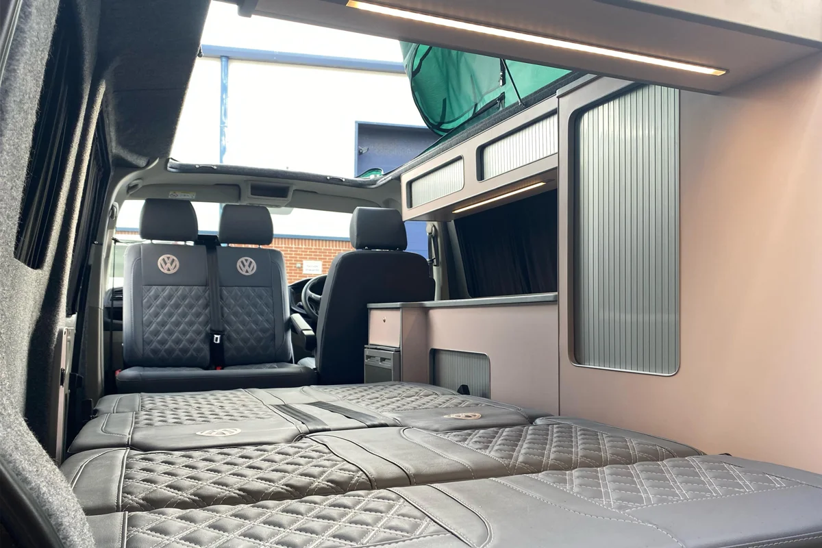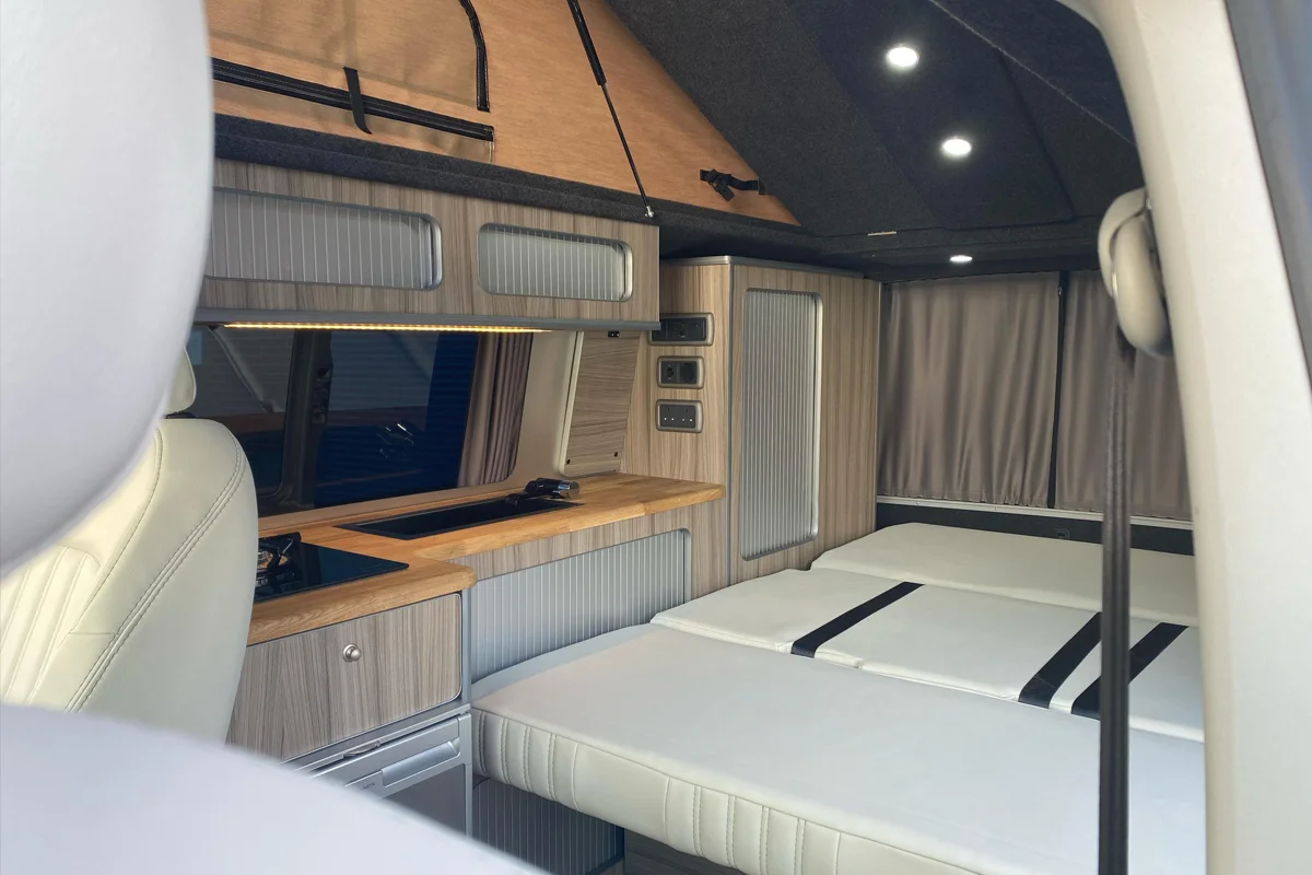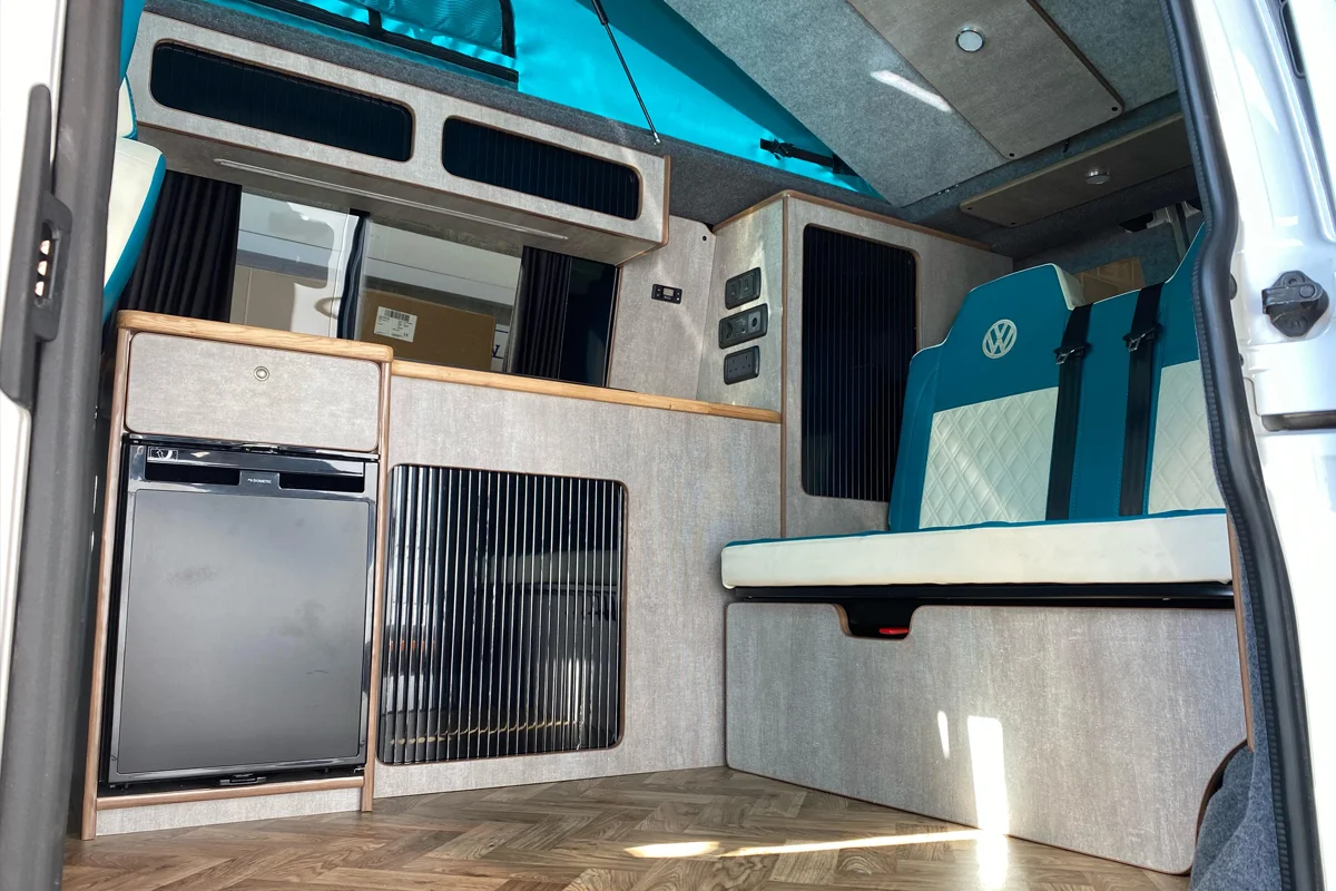 We manufacture bespoke camper units using high quality products, allowing us to make the most of the space available in the van. The colours and unit types can all be choosen by you. We then fit a double hob cooker, sink and a Waceo fridge so you cook tasty meals wherever you are. Towards the rear of the van you find the wardrobe section that you can pack to the brim with all your camping essentials.