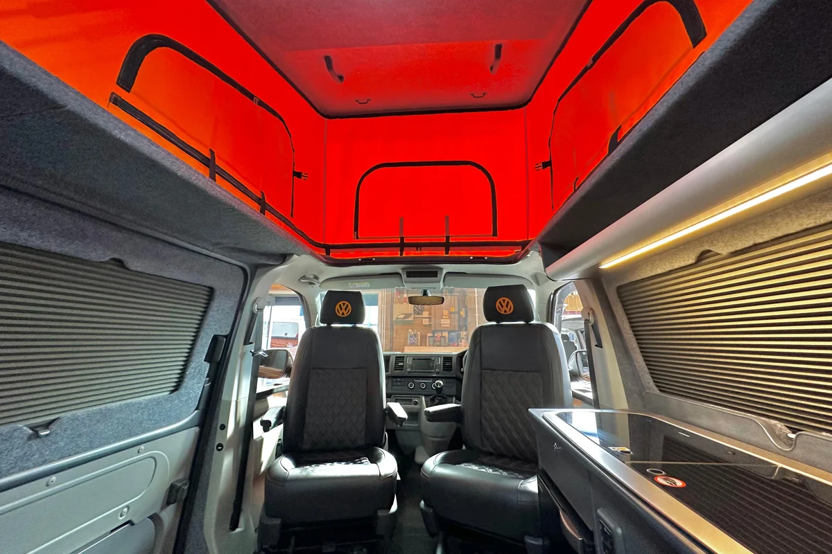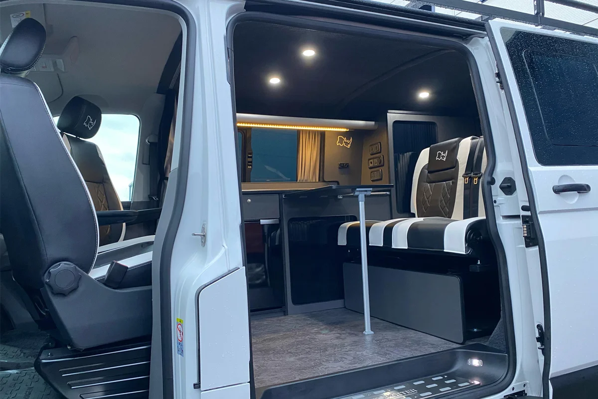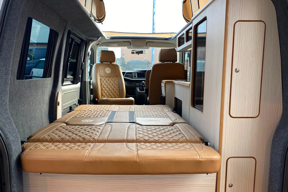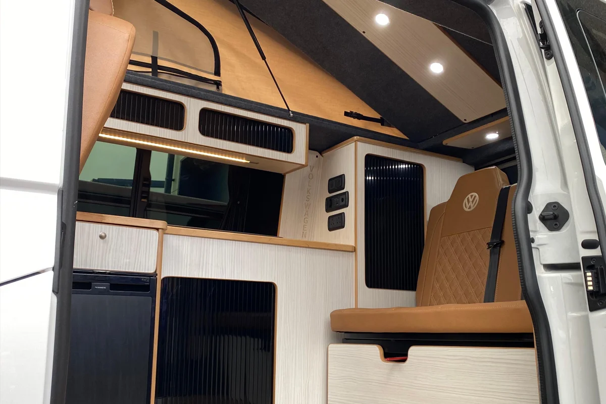 We manufacture bespoke camper units using high quality products, allowing us to make the most of the space available in the van. The colours and unit types can all be choosen by you. We then fit a double hob cooker, sink and a Waceo fridge so you cook tasty meals wherever you are. Towards the rear of the van you find the wardrobe section that you can pack to the brim with all your camping essentials.