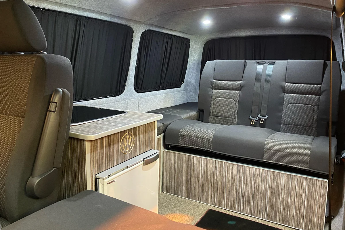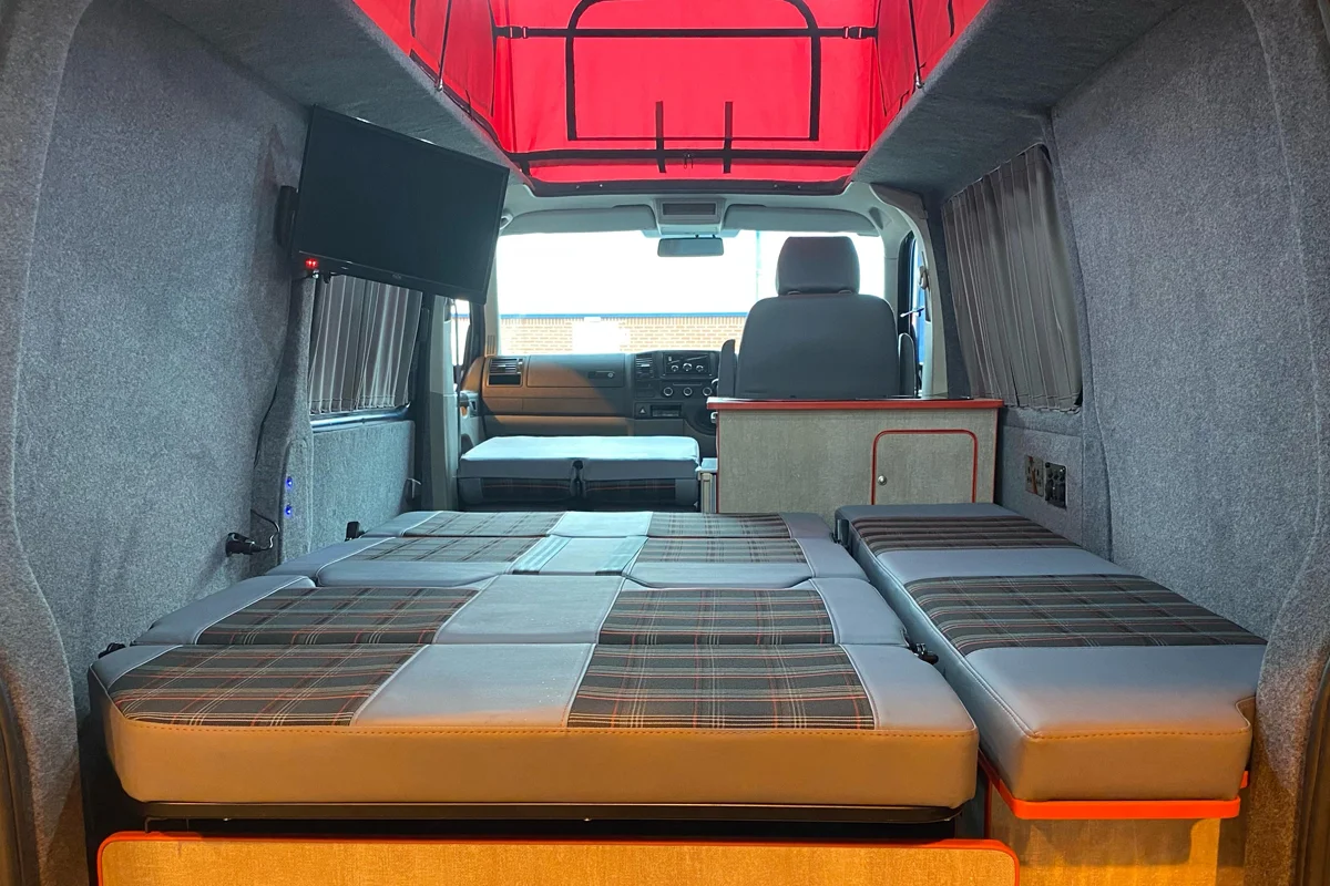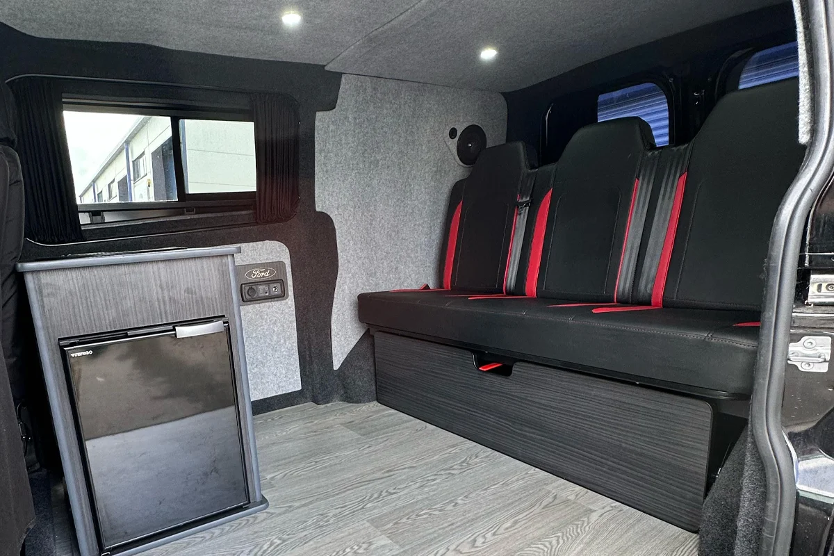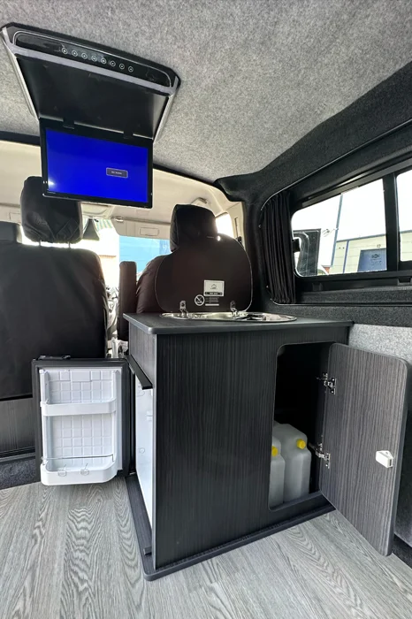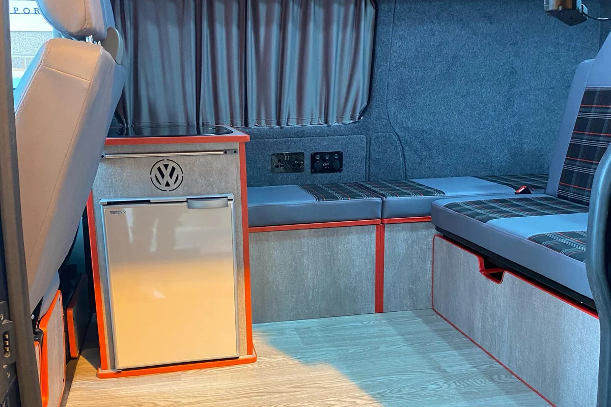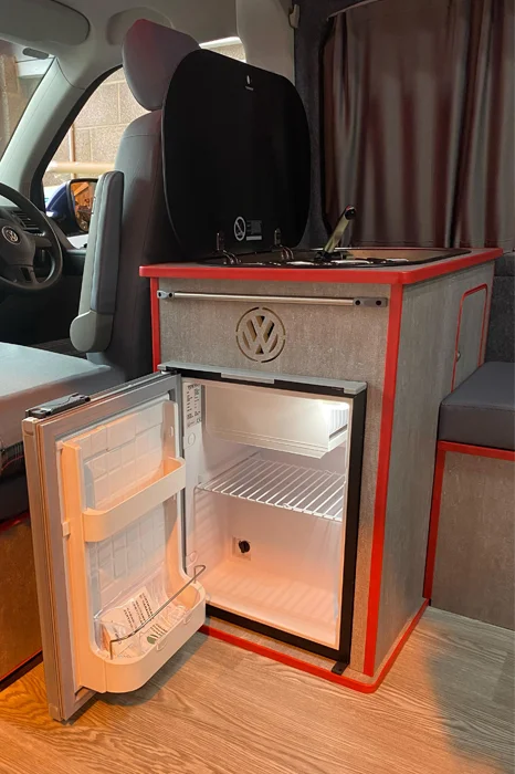 What makes our day vans unique is our fully customised kitchen pod. This can be designed to suit your exact needs. Typically our customers opt to have a double hob and sink and premium fridge fitted within. This setup includes a gas and water bottle so you're ready to cook straightaway. All our kitchen pods are removable, simply unbolt the four high tensile bolts and lift the lightweight unit out. We can also fit a custom panel that will sit along side the pod to give you a USB charging point, cigarette socket and volt meter.
